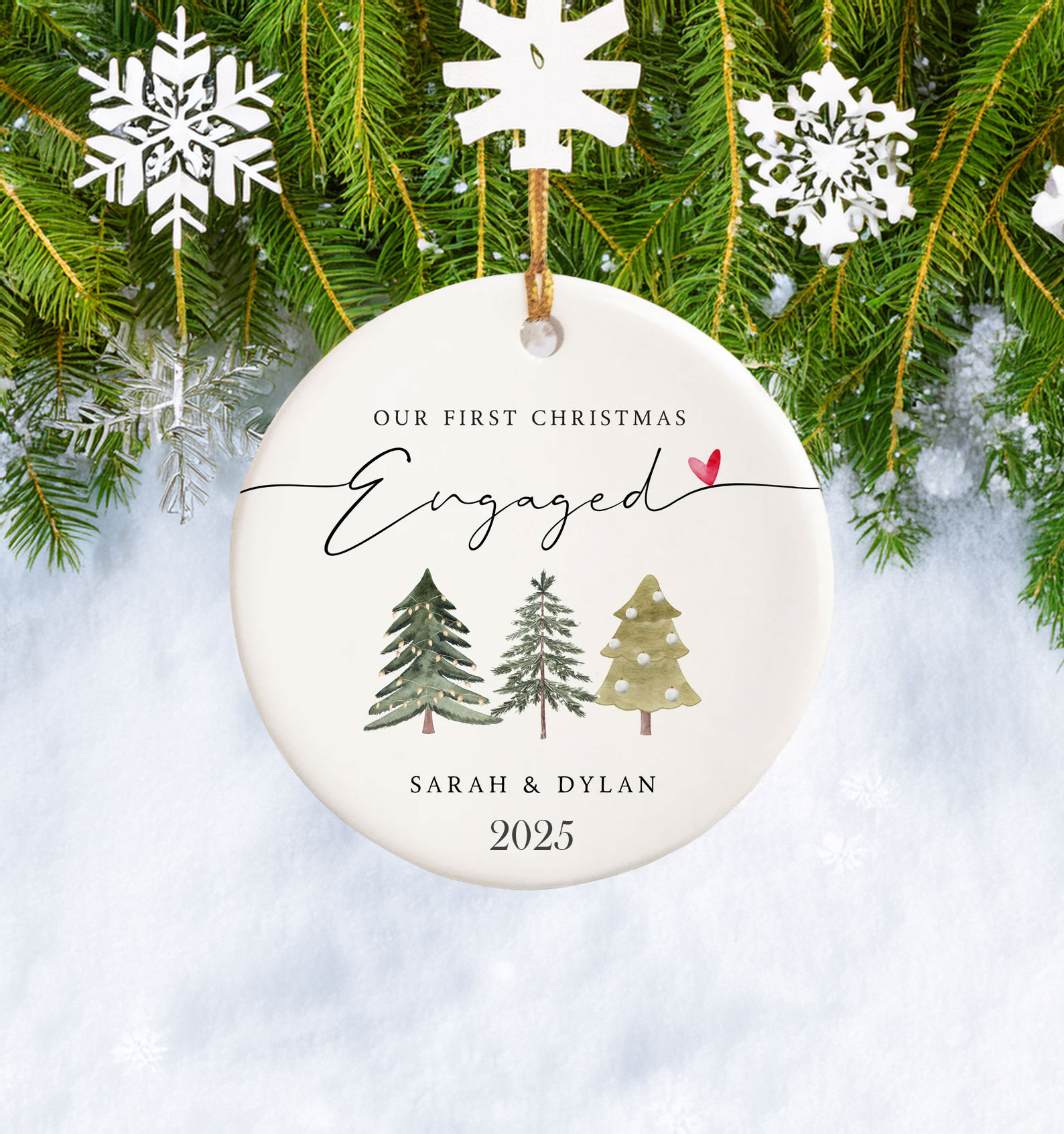 Featuring elegant design details and custom personalization options (names, date, or engagement year), this ornament transforms your love story into a cherished keepsake. Hang it proudly on your Christmas tree to mark your first holiday season as an engaged couple — or gift it as a heartfelt token that captures the excitement and romance of this special time.