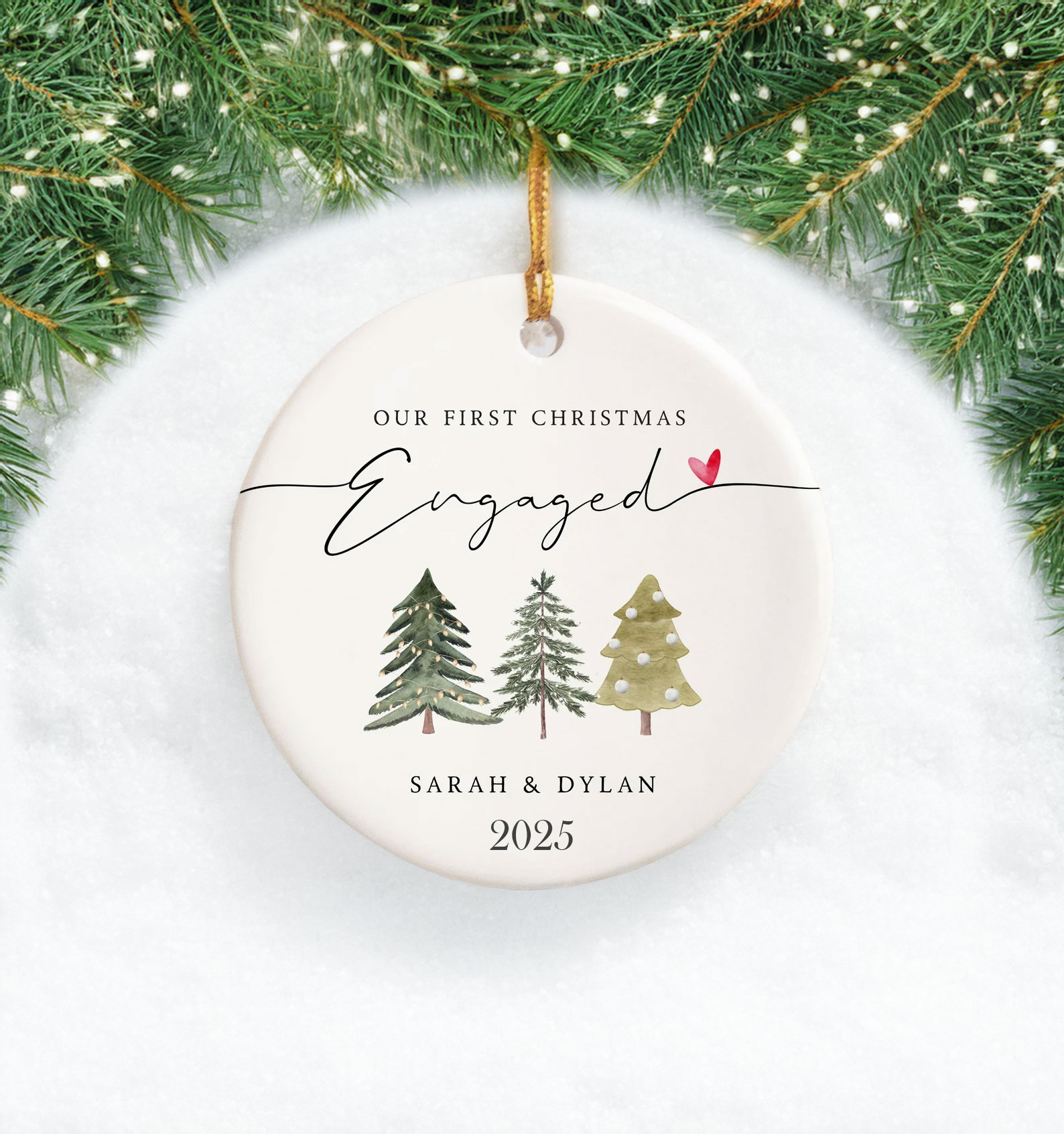Design: “Our First Christmas Engaged” with customizable names, date, or year